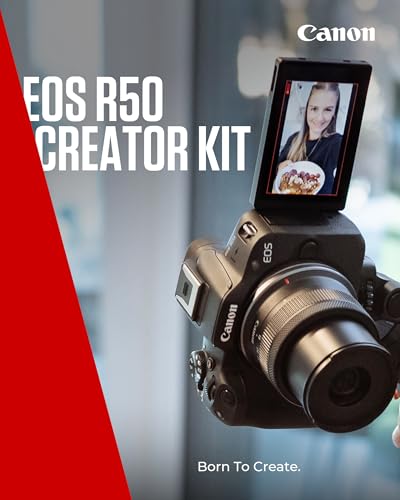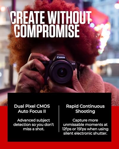 Since we were founded in Japan in 1937, Canon has been helping people reimagine and push the boundaries of what is possible through imaging. Elevate your creativity with the Canon EOS R50, a top-performing mirrorless camera designed for content creators. Capture stunning professional-looking stills and 4K 30p movies with its 24.2 megapixel APS-C sensor. This compact camera is perfect for vlogging and photography, offering true-to-life quality that will impress your followers. The EOS R50 features a flexible Vari-angle touchscreen, allowing you to explore more angles and perspectives. For an immersive experience, use the electronic viewfinder to block out distractions. The Dual Pixel CMOS AF II with deep learning technology ensures you never miss a shot by automatically recognizing, focusing on, and tracking moving subjects. Whether you’re a beginner or a seasoned professional, the Canon EOS R50 is your ideal digital camera for capturing life’s moments. Your creative breakthrough awaits with this portable camera that combines professional performance with ease of use.