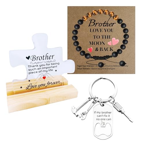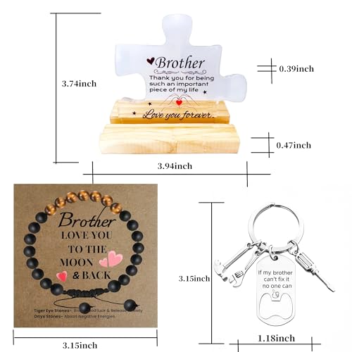 Thoughtful Birthday Gifts for Brother: This set includes a heartfelt puzzle piece decor with the message “Brother, thank you for being such an important piece of my life,” a Tiger Eye & Onyx bracelet, and a practical engraved keychain.