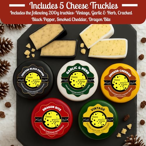 • Luxury Festive Cheese Gift: An eye-catching Christmas cheese selection of five gourmet cheddar truckles, stacked in a festive tree shape for a standout centerpiece, ideal for him and for her.